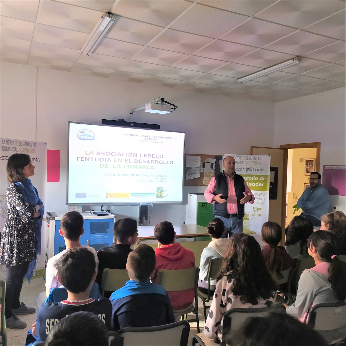 Es de destacar que, esta iniciativa está teniendo muy buena acogida por parte de la comunidad educativa y consiste por un lado, en ilustrar mediante una presentación audiovisual qué es CEDECO-Tentudía, su ámbito de actuación, su entramado dentro de las diferentes redes de desarrollo rural regional, nacional y europea, y como no, la labor y los proyectos apoyados por esta entidad asociativa conocida como Grupo de