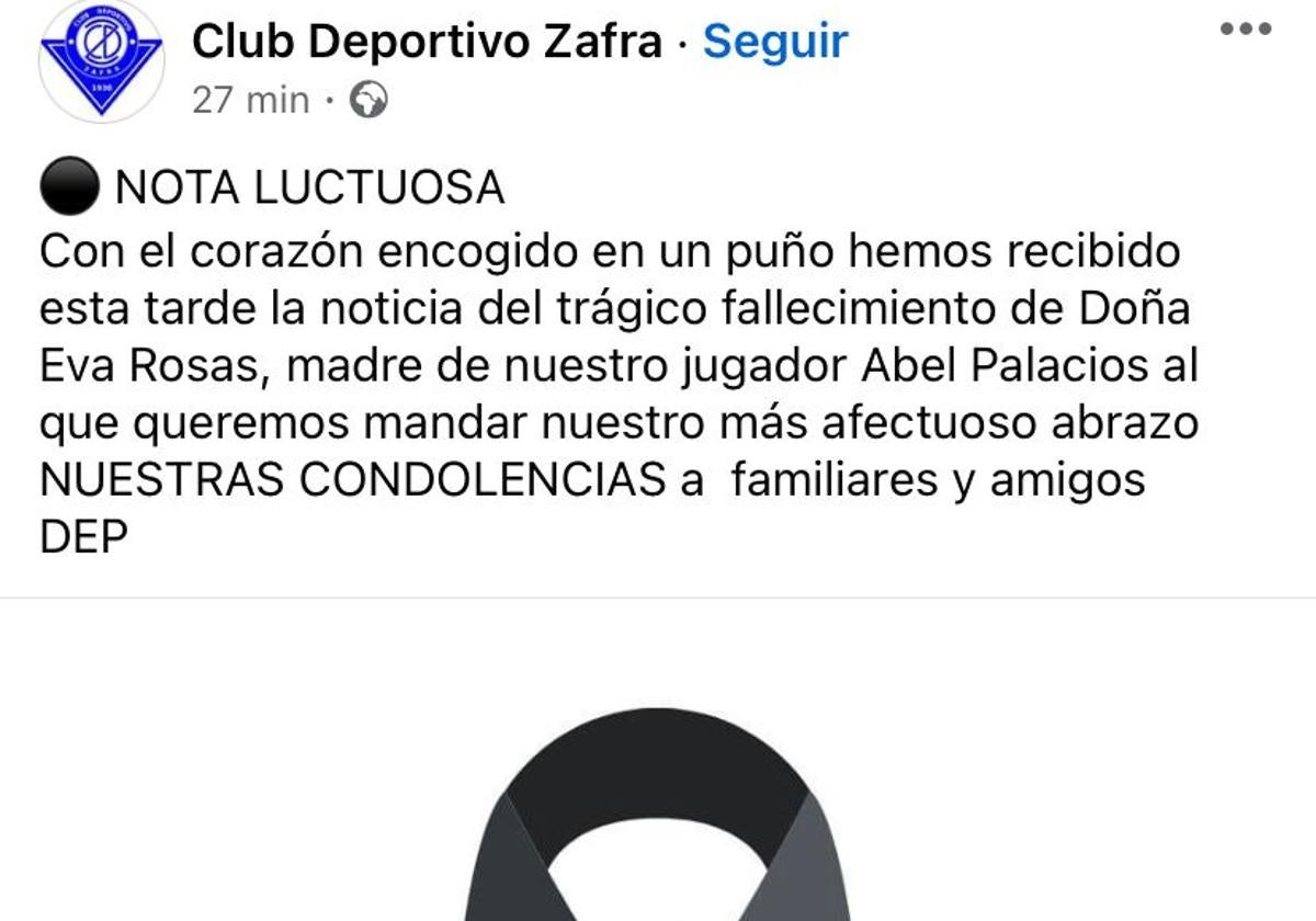 El mundo de deporte ha expresado sus condolencias tras conocer el fallecimiento de Eva Rosas, madre del jugador del CD Zafra Abel Palacios