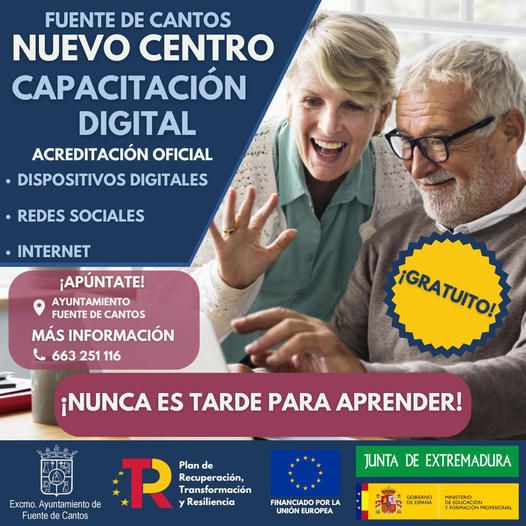 El Ayuntamiento de Fuente de Cantos, en colaboración con la Junta de Extremadura y la Unión Europea, pone en marcha un nuevo Centro de Capacitación Digital. Bajo el lema «Nunca es tarde para aprender», esta iniciativa ofrece cursos gratuitos para toda la población, sin límite de edad, y con el objetivo de facilitar el acceso a las herramientas digitales.